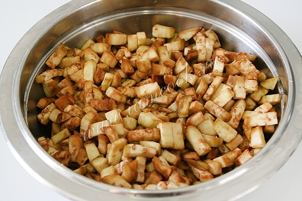 Баклажаны очистите и нарежьте небольшими кубиками. Хорошо посолите и перемешайте. Оставьте на 30 минут. По истечении этого времени хорошо их промойте водой.