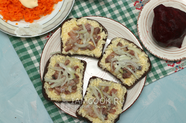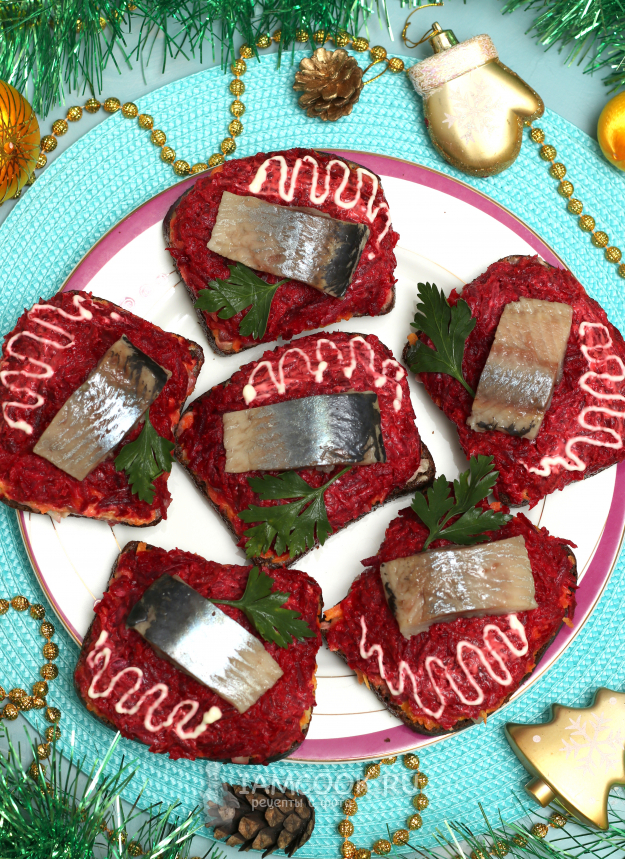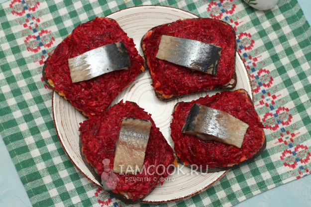Намазать бутерброды свекольным слоем и сверху положить по кусочку филе, которое мы отрезали в самом начале.