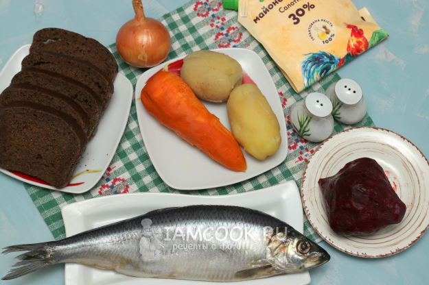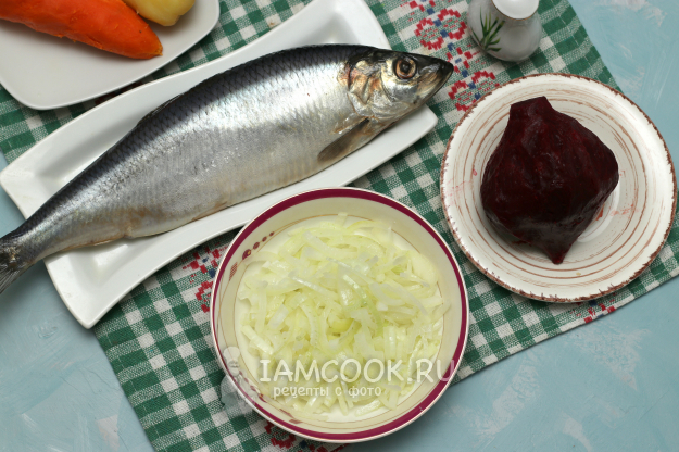 Для приготовления бутербродов «Сельдь под шубой» подготовить из списка необходимые ингредиенты. Все овощи я сварила заранее, но их можно сварить, пока вы будете заниматься разделыванием сельди. Затем овощи остудить и почистить.