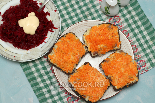 Картофельной массой смазать хлеб, сверху разложить мелко нарезанную сельдь и маринованный лук. Натереть на тёрке морковь, смешать её с майонезом, немного посолить.