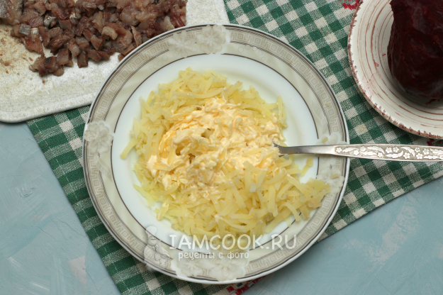 Картошку натереть на тёрке, добавить немного соли и перца, а также чуть майонеза, перемешать.