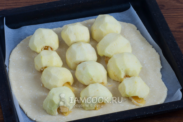 У этого пирога очень необычный, интересный внешний вид! Вкусное тесто приготовлено с добавлением творога, а начинки получается много и она очень мягкая сочная, т.к. состоит из половинок яблок. А внутрь этих яблочных половинок можно положить еще какой-нибудь сюрприз: сухофрукты, густой джем, орешки... Это сделает каждый пирог особенным и эксклюзивным!