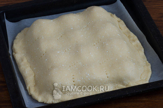 Вторую половинку теста раскатайте в пласт такого же размера, как нижний. Накройте яблоки тестом, защипните края. Наколите тесто вилкой.