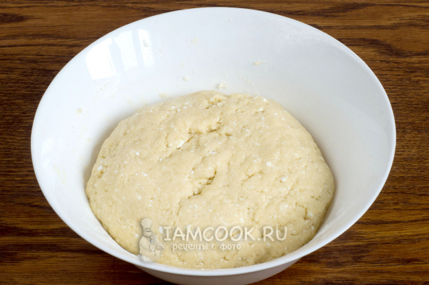 Муку соедините с разрыхлителем и ванильным сахаром. Просейте в творожную массу. Замесите мягкое тесто (если тесто липкое, то добавьте еще немного муки, я положила еще 2 ст.л.). Поставьте готовое тесто в холод на 30 минут.