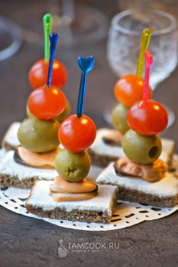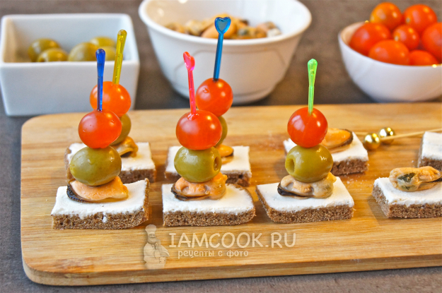 Затем насадите на шпажку помидорку, оливку и воткните в мидий и хлеб.