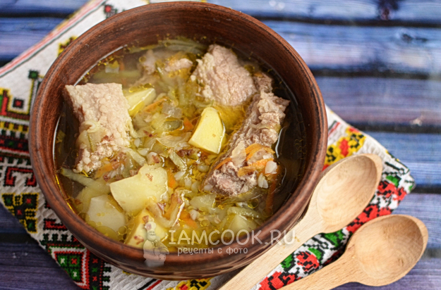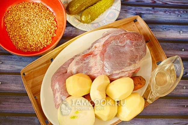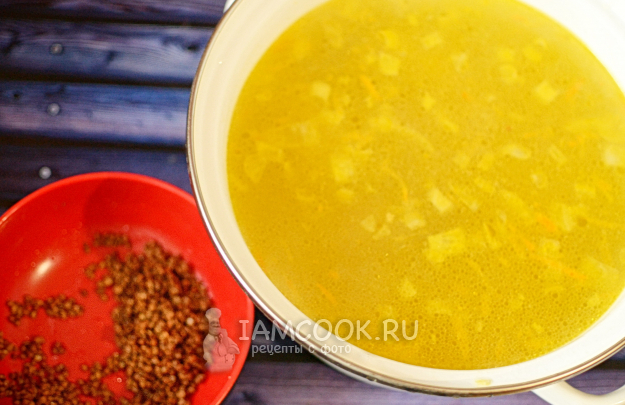 Когда свинина разварится до мягкого состояния, добавим в кастрюлю картошку, пассеровку и гречку, промытую несколько раз. Снова поставим на огонь и поварим 20 минут до готовности картошки.