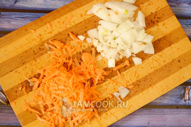 А пока варится свинина, подготовим остальные ингредиенты. Морковку натрем, а лук нарежем мелко.