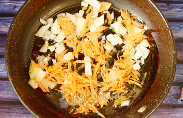 Морковку и лук выложим на сковороду, поджарим на растительном масле.