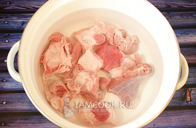 Сложим мясо в кастрюлю с водой, немного посолим, поставим на огонь, доведем до кипения, соберем пену и будем варить час под крышкой.