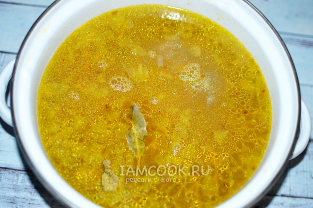 В готовый суп добавим лавровый лист, немного поперчим, попробуем суп на вкус, подсолим, если нужно.