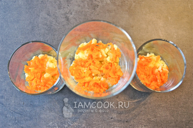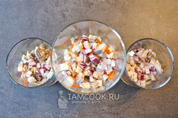 Филе сельди и лук нарежьте на маленькие кусочки и выложите на морковь. Если у вас целая селедка, ее необходимо очистить от внутренностей, снять кожу и отделить филе от костей.