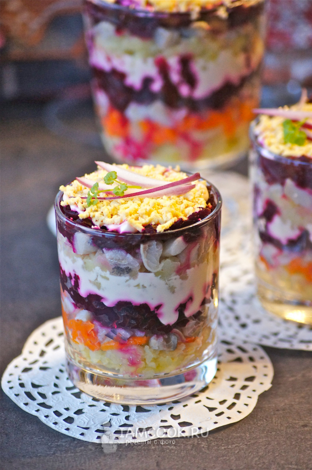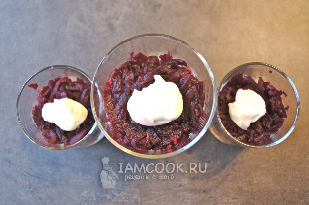 Далее выложите слой свеклы, смажьте майонезом и повторите все слои.