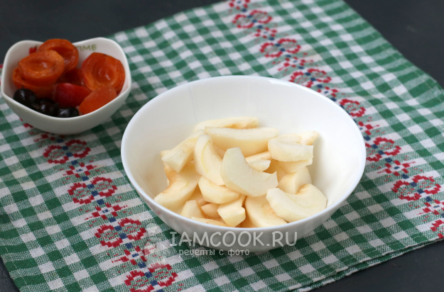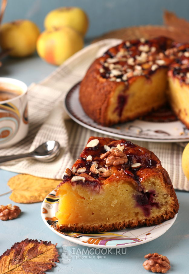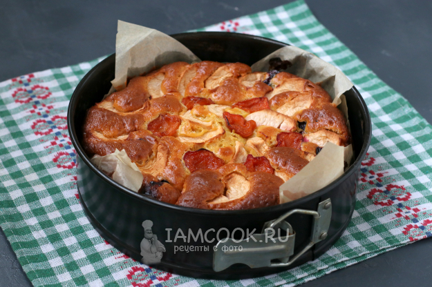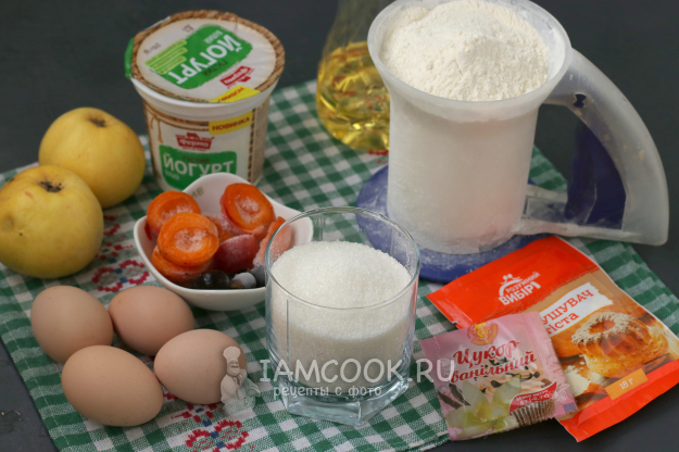 Предлагаю вам простой пирог на йогурте с фруктами, который хорош тем, что быстро готовится. А ещё в этом пироге можно менять фрукты по сезону или наличию запасов в морозилке и каждый раз получать новый вкус. Рекомендуется смазывать верх пирога абрикосовым джемом, но я думаю, что можно любым - это тоже вариант разнообразия вкуса пирога. Я в этот раз использовала яблоки, абрикосы и йошту из заморозки. Замороженные фрукты следует предварительно разморозить. Верх я смазывала виноградным джемом, ещё и орешками сверху посыпала, можно просто сахарной пудрой посыпать.