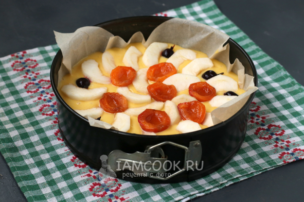 Застелить пергаментом форму 22 см, вылить тесто, несколько раз прокрутить форму, чтобы тесто прилипло к стенкам и вышел лишний воздух. Затем сверху произвольно разложить фрукты.