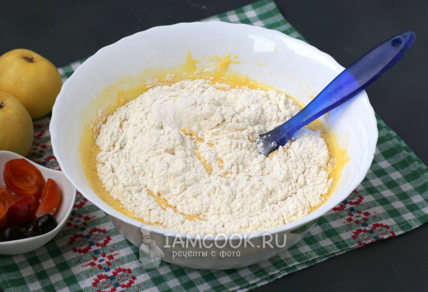Затем добавить в тесто просеянную муку с разрыхлителем и ванильный сахар, аккуратно перемешать.
