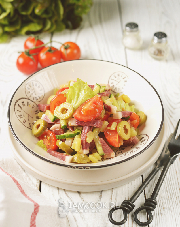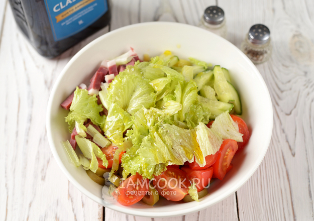 На стол салат с копченым языком и овощами подавайте сразу же после приготовления.