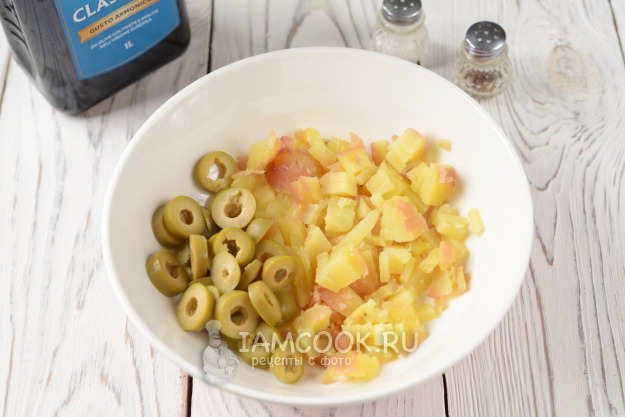 Нарежьте картофель меленьким кубиком, оливки нарежьте кружочками, сложите в глубокую миску.