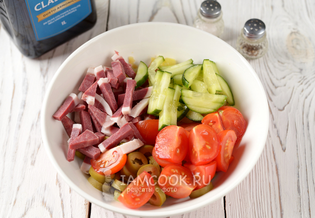 Помидоры черри нарежьте четвертинками, говяжий язык и свежий огурец - соломкой.