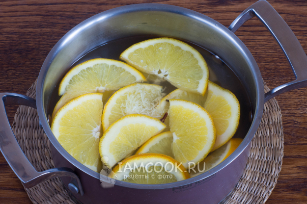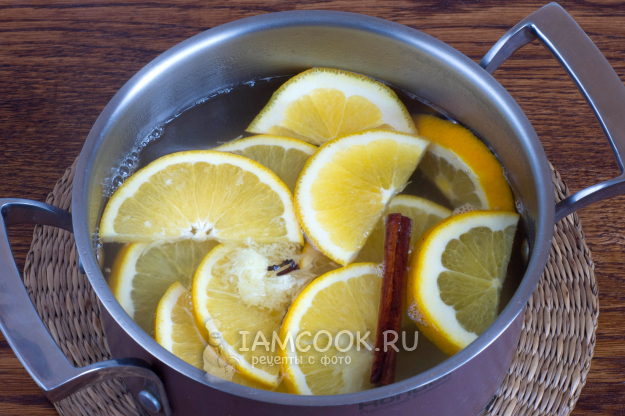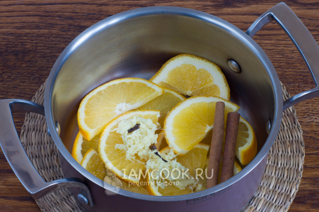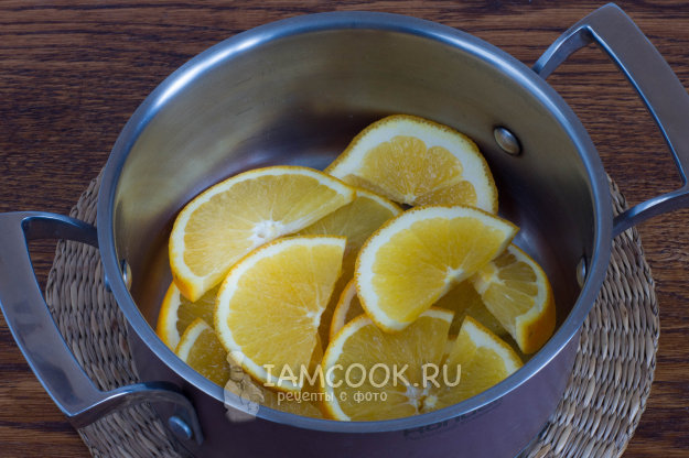 Апельсин тщательно промойте и нарежьте полукольцами. Положите в кастрюлю или в большой заварочный чайник.