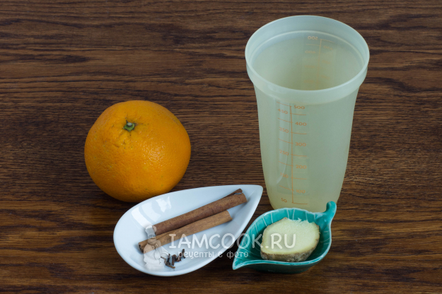 У имбиря срежьте шкурку, мякоть натрите на мелкой терке. Добавьте измельченный имбирь и пряности к нарезанному апельсину.