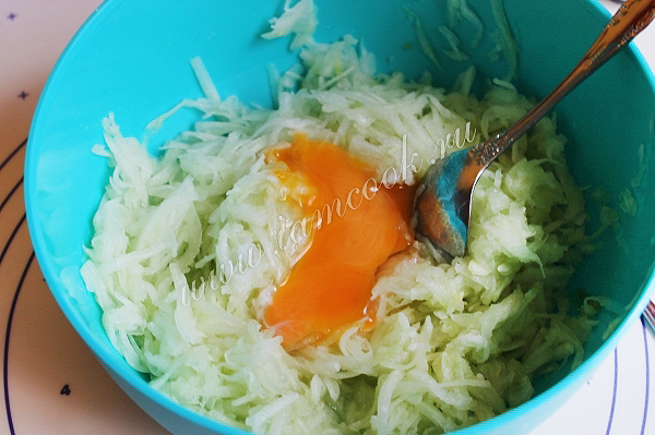 В кабачки добавим соль, дадим им немного постоять чтобы они пустили сок и обязательно отжимаем его. Затем добавляем соду и желтки.