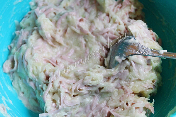 Затем добавим колбасу и муку. Хорошенько размешаем. Тесто должно быть не густым.