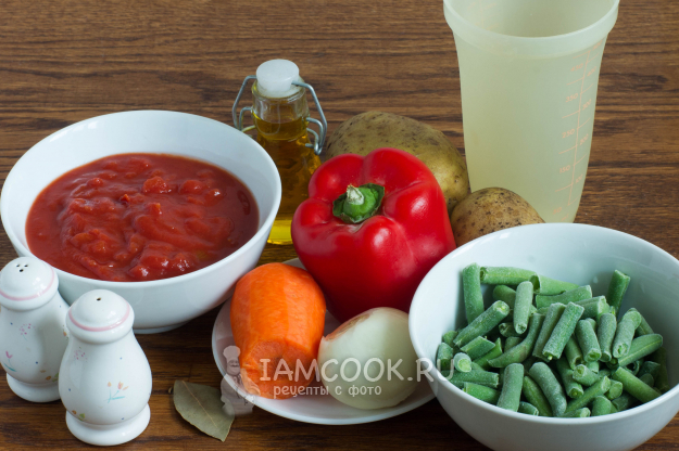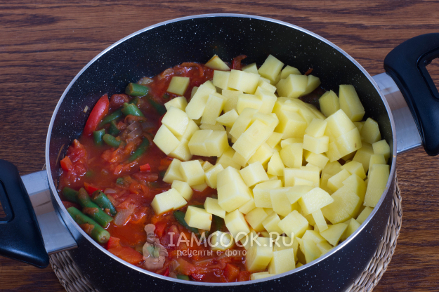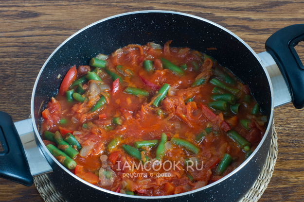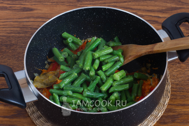 Добавьте стручковую фасоль (у меня - замороженная, уже нарезанная на кусочки около 2-3 см). Готовьте все вместе еще 2-3 минуты.