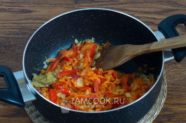 На дне кастрюли подходящего объема разогрейте растительное масло. Очищенную морковь натрите на крупной терке. Лук почистите и нарежьте кубиками. Сладкий перец почистите, нарежьте недлинными полосками. Добавьте измельченные овощи в кастрюлю. Положите лавровый лист, черный молотый перец и другие пряности по вкусу. Обжаривайте, помешивая, до мягкости овощей.