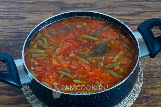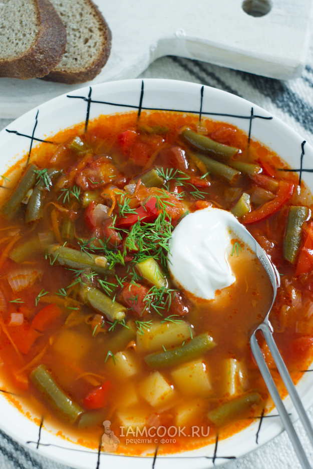 При подаче суп со стручковой фасолью и болгарским перцем можно дополнить свежей сметаной и каждую порцию посыпать измельченной зеленью.