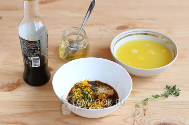 Натрем цедру с одного апельсина, выжмем 150 мл сока, для этого понадобилось два апельсина. Смешаем цедру, мед, соевый соус, измельченный чеснок, оборвем листики тимьяна с веточек, добавим половину апельсинового сока, размешаем.