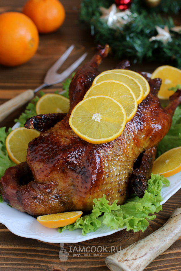 Запеченная в духовке утка в апельсиновом соусе готова к дегустации.