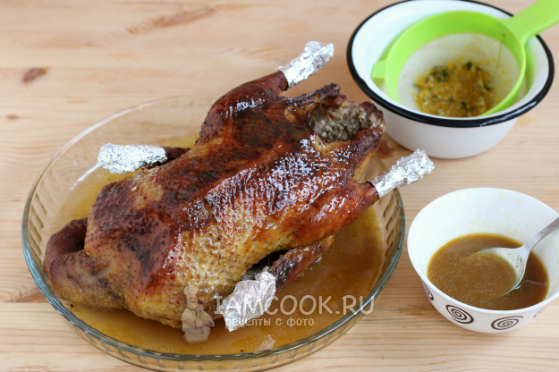После достанем утку, разрежем пакет и уберем его. Обернем кончики ножек и крылышек фольгой, чтобы они не подгорали. Смешаем процеженную оставшуюся апельсиновую смесь с апельсиновым соком и жиром, выделившимся из утки, щедро польем этим соусом утку и снова поставим в духовку на 10 минут, после польем утку соусом еще раз и допечем еще 10-15 минут, до появления румяной корочки.
