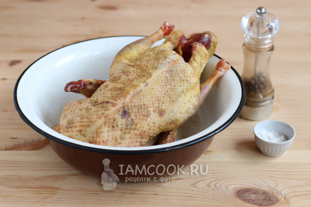 Утку тщательно промоем и обсушим бумажными салфетками. Натрем ее снаружи и внутри солью и молотым перцем, уложим в большую миску.
