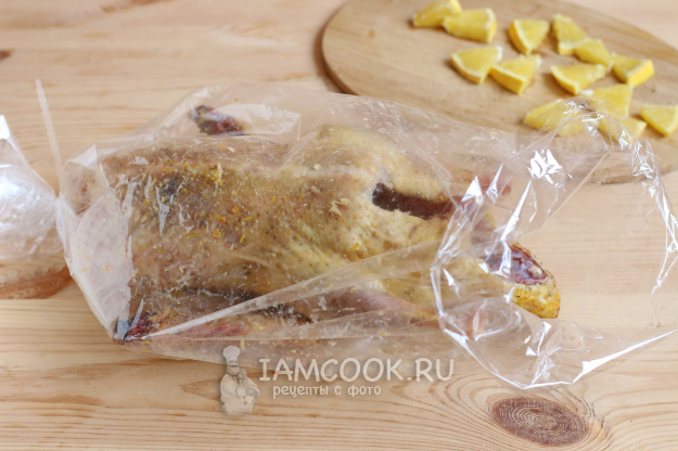 На следующий день достаем утку и помещаем в пакет для запекания. Половину оставшегося третьего апельсина нарежем маленькими дольками и уложим утке в брюшко. Плотно завяжем концы пакета, оставляя внутри пространство, чтобы тушка утки лежала свободно. Укладываем пакет с уткой на противень или в форму и запекаем в заранее разогретой духовке при 180 градусах примерно полтора часа.