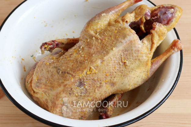 Отложим столовую ложку смеси, а остальной обмажем утку со всех сторон и уберем птицу в холодильник на ночь или сутки.