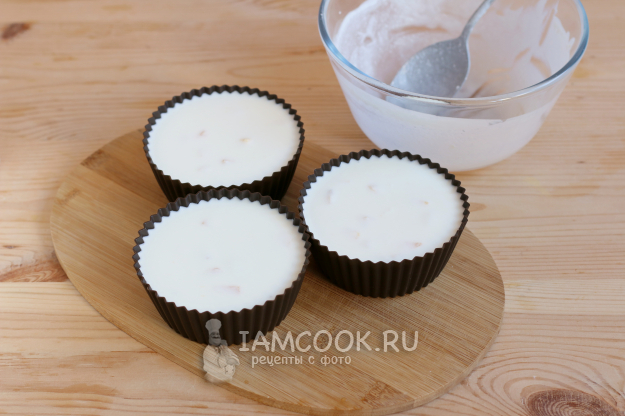 После разливаем смесь с фруктами в силиконовые формочки и ставим в холодильник для застывания. У меня силиконовые формочки большие, примерно 10 см в диаметре, поэтому если ваши формочки меньше, то порций будет больше.