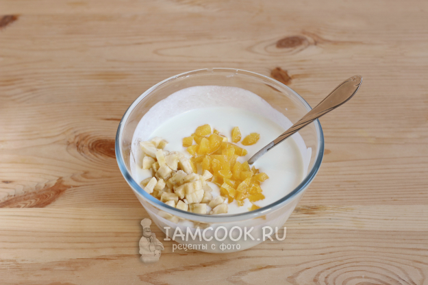 Нарезаем 2/3 банана мелкими кусочками, так же нарезаем апельсин. Добавляем нарезанные фрукты в молочную смесь и аккуратно перемешиваем ложкой для равномерного распределения.