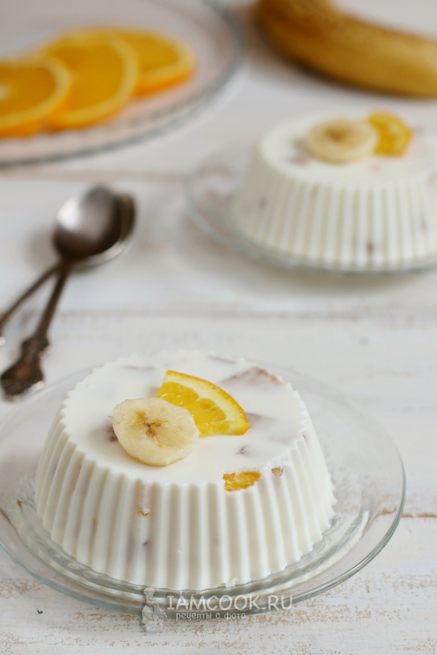 Готовое бланманже с фруктами извлекаем из формочек и подаем в качестве десерта. Такой десерт можно есть даже вечером, не боясь за свою фигуру.