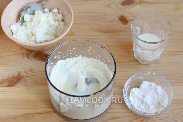 Творог измельчим в блендере до состояния однородной массы без комочков. Для удобства это можно делать частями, после добавляем в творог молоко и сахарную пудру, смешиваем.