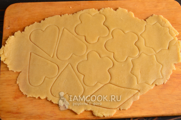 От кусочка теста отрежьте часть, остальное снова уберите в холодильник. Тесто раскатайте в тонкий пласт и с помощью формочек повырезайте заготовки.