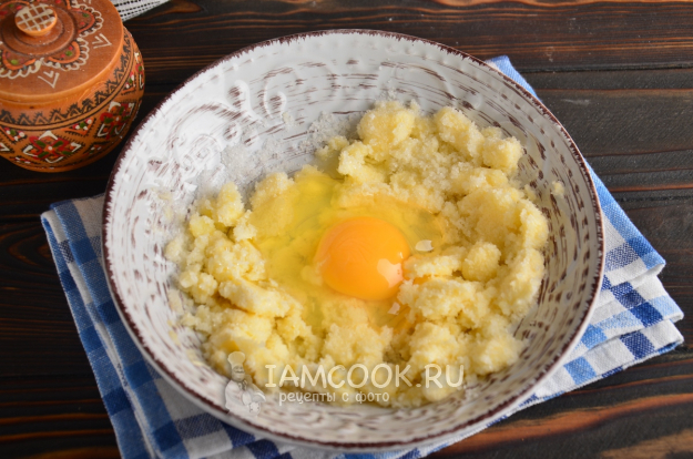 Теперь в миску с маслом и сахаром нужно вбить свежее куриное яйцо и все размешать.