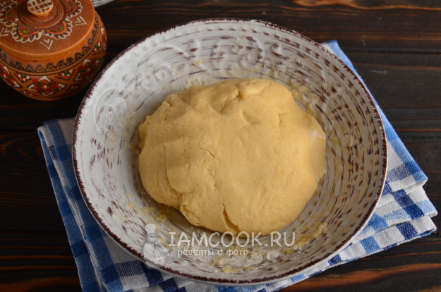 Добавьте просеянную пшеничную муку с разрыхлителем, а также ванильный сахар. Замесите мягкое песочное тесто.
