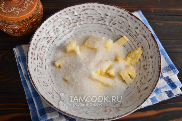 Сливочное масло нужно нарезать кусочками, сложить в миску и засыпать сахаром.