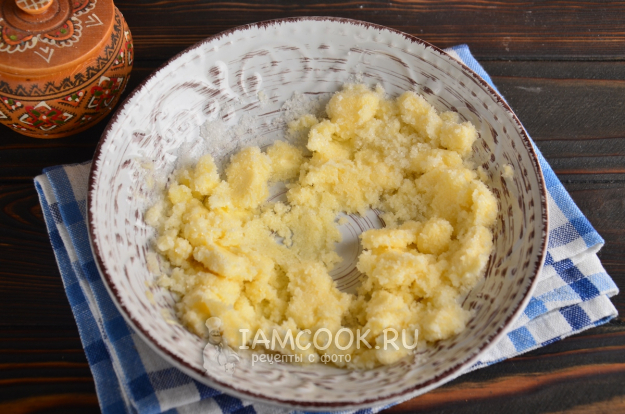 Столовой ложкой нужно растереть кусочки масла с сахаром.