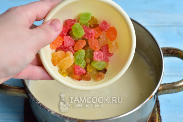 Добавьте в кастрюлю с крупой цукаты. Хорошо перемешайте всё ложкой.