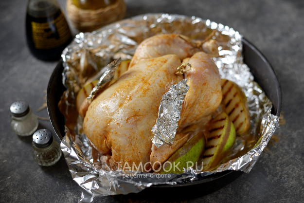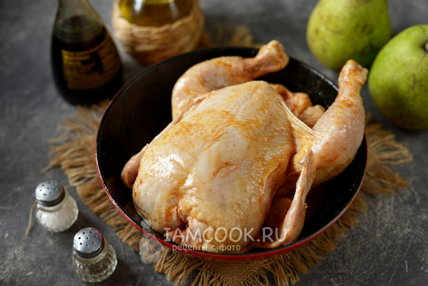 Вложите несколько ломтиков груши в брюшко курицы, защипните его зубочисткой или бамбуковой шпажкой, ножки свяжите кулинарным шпагатом. Переложите курицу в форму для запекания, обложите ее со всех сторон ломтиками груши. Отправьте курицу с грушей в духовку, предварительно разогретую до 190 градусов, на 60 минут.