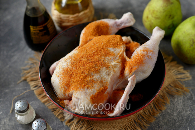 Посыпьте куриную тушку щедрой приправой, добавьте соль и перец.