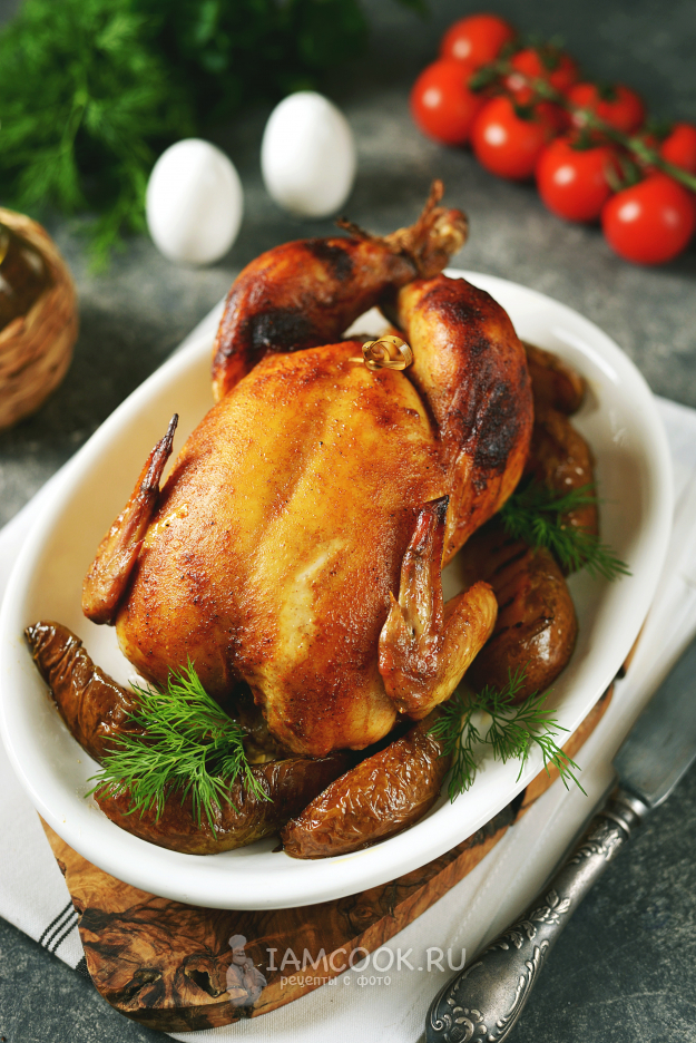 Подготовьте все необходимые продукты по списку. Идеальной для запекания считается тушка до 1,5 кг весом. Курицу помойте под проточной водой, обрежьте лишний жир в брюшке.