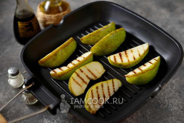 Груши нарежьте четвертинками, обжарьте до легких подпалин на сковороде-гриль.