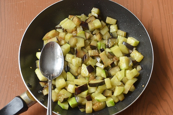 Кабачок и баклажан нарезать маленькими кубиками, посолить, обжарить на растительном масле в течение 5-7 минут до мягкости.